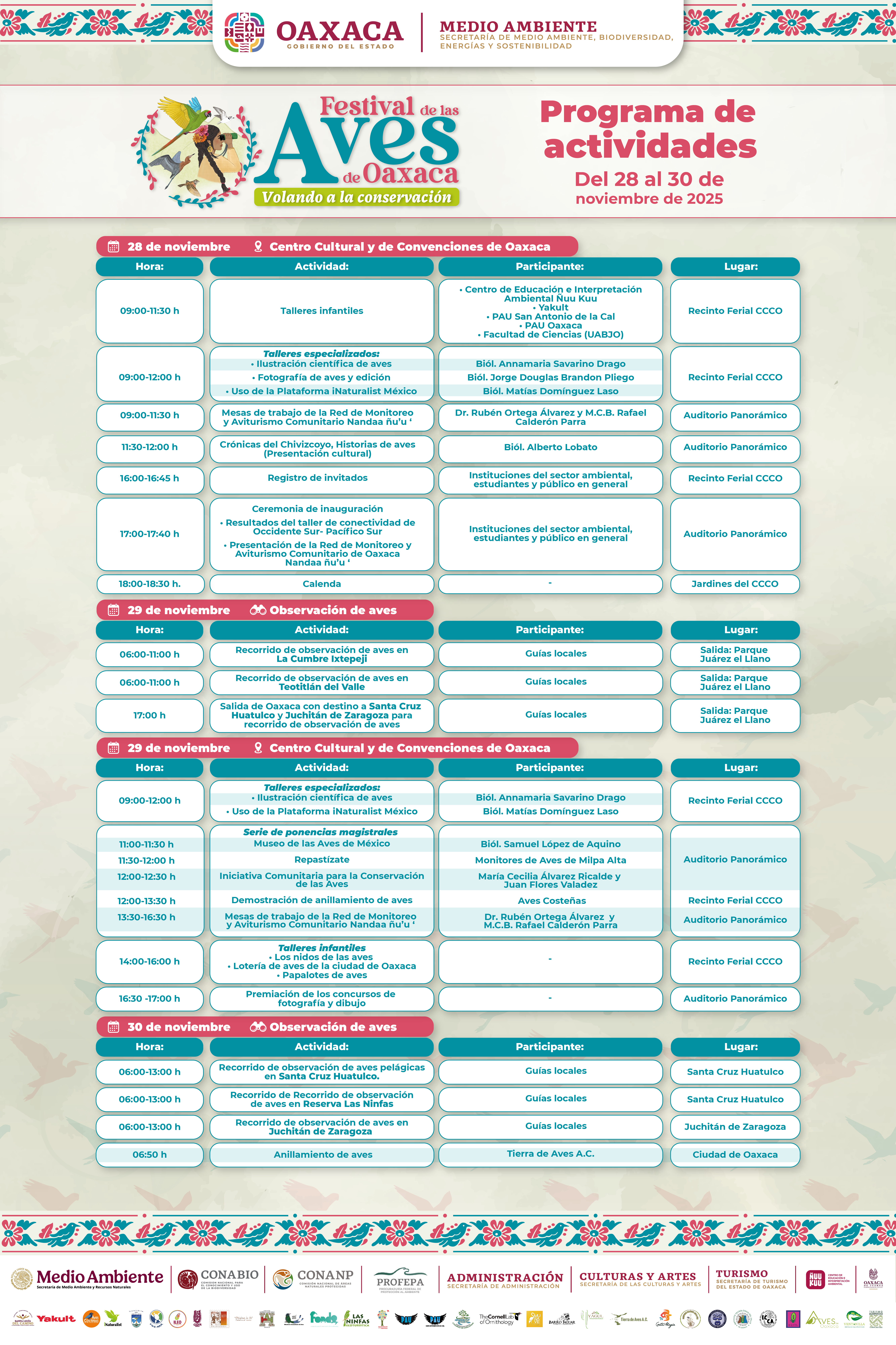 Consulta el programa completo del Festival de las Aves de Oaxaca 2024, del 25 al 30 de noviembre. Descubre horarios, lugares de charlas, rutas de observación y muchas sorpresas. ¡No te pierdas nada de este evento único!